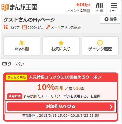Myページのクーポンから、対象作品一覧ページを見ることが出来ます。