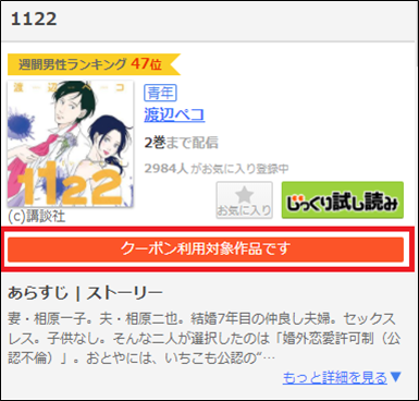 クーポン対象コミックのページにも、「クーポン利用対象作品です」という注意書きが表示されます。